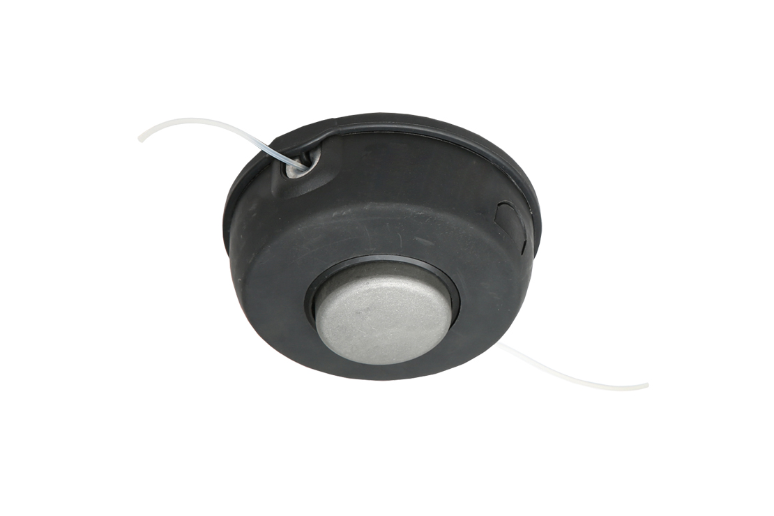 Cabeça de corta-relva preta e prata com fio branco em fundo branco