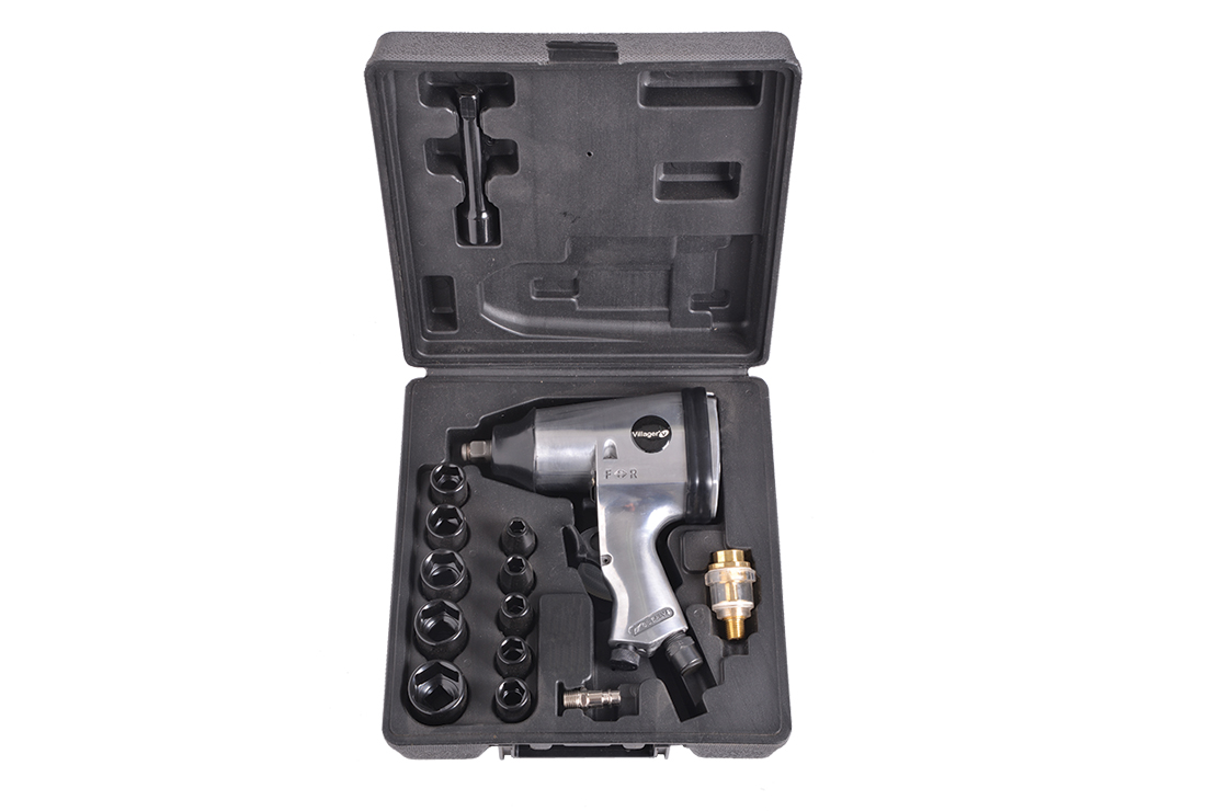Estojo com pistola pneumática prateada e soquetes metálicos