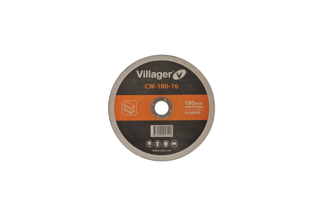Disco de corte Villager CW-180-16 com etiqueta preta, cinza e laranja