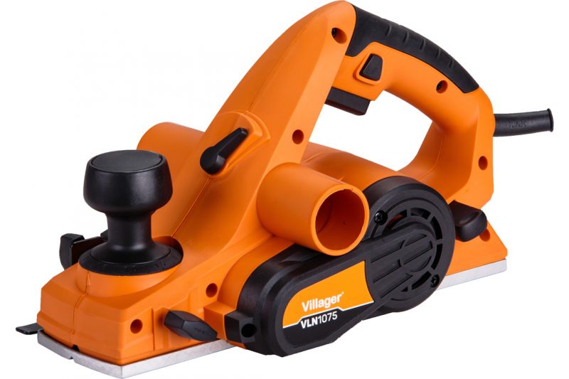 Plaina elétrica laranja e preta Villager VLN1075 sobre fundo branco
