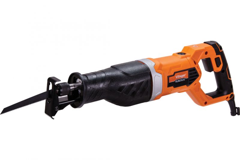 Serra tico-tico elétrica laranja e preta com lâmina dentada