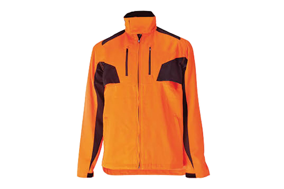 Casaco de trabalho laranja com detalhes pretos e fecho de correr