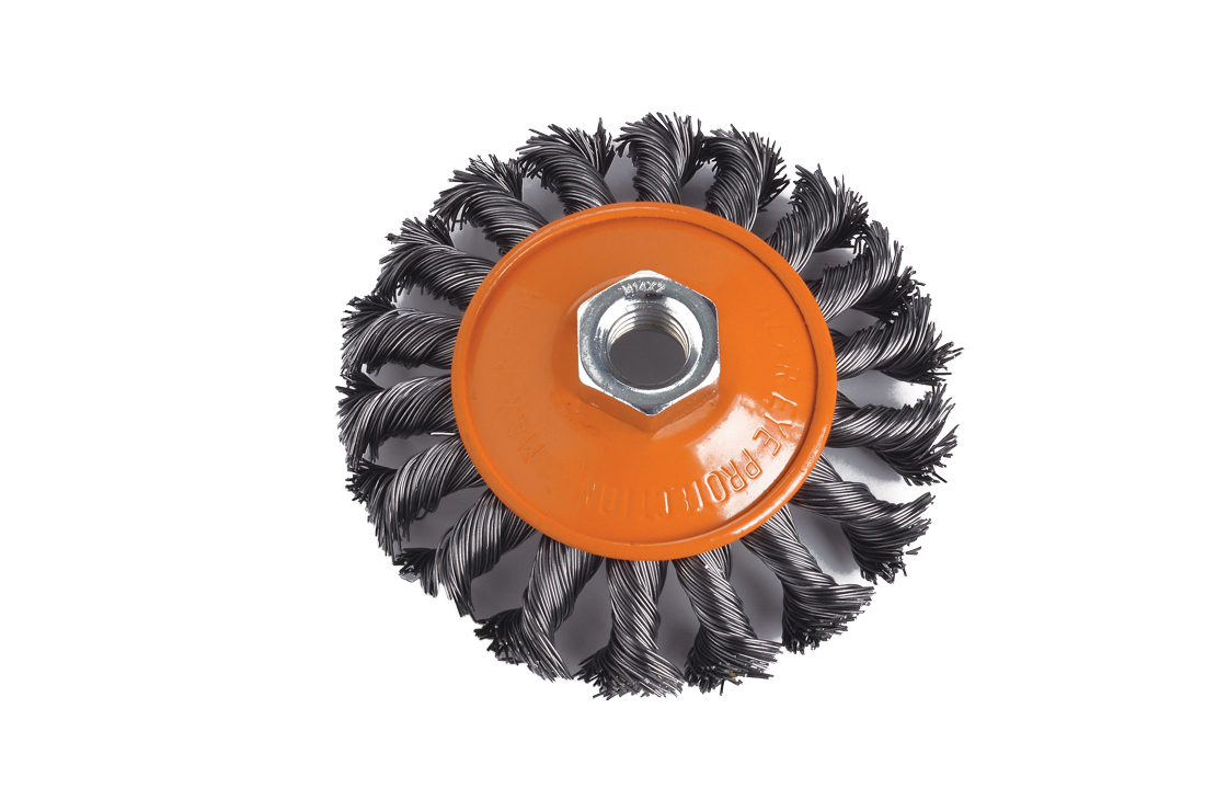 Escova circular metálica com centre laranja e cerdas de aço retorcidas